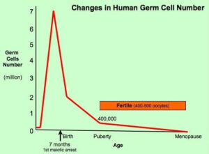 Ao nascer, a menina já terá perdido cerca de 80% de seus óvulos imaturos. Aproximadamente 500 mil óvulos imaturos são encontrados nos ovários da menina na puberdade, quando por ação de estímulos hormonais, completarão sua maturação e serão liberados, geralmente um por mês. Cerca de apenas 500 óvulos serão maturados e liberados durante toda a vida reprodutiva da mulher.